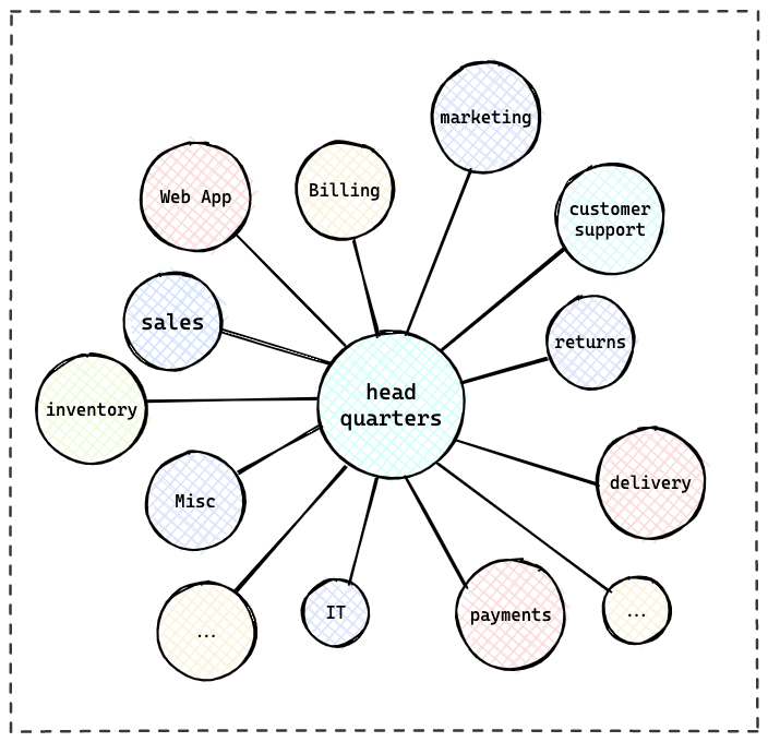 There are definitely advantages and disadvantages to this approach. One of the advantages being Communication. When everyone is working from the same place it is easier to co-ordinate and faster action can be taken which can make the entire operation faster. One of the disadvantages is SPOF (Single Point of Failure). If the headquarter faces a natural disaster like fire or flood. The entire business will be down since there are no backups.